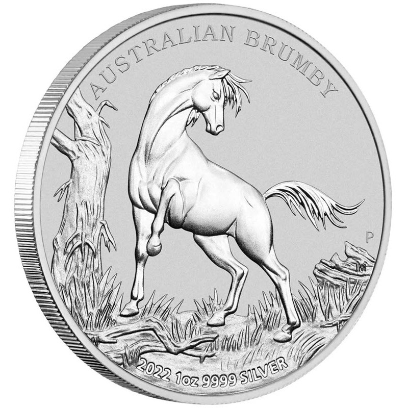 На реверсе изображен брамби с поднятой ногой рядом с деревом. Справа у канта монограмма Пертского монетного двора Р, ниже инициалы дизайнера JM (Jennifer McKenna). Вдоль канта надпись: AUSTRALIAN BRUMBY 2022 1oz 9999 SILVER (австралийский брамби, год чеканки, вес и проба серебра).