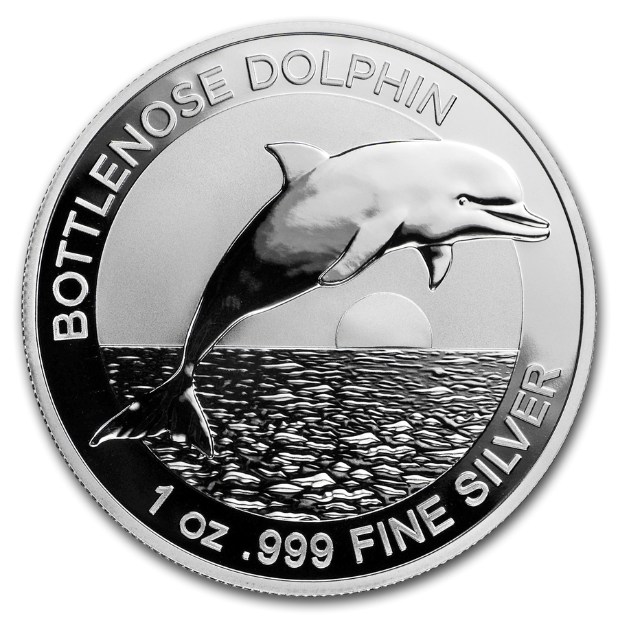 Изображение дельфина-афалины, выпрыгивающего из воды на фоне заката. Вес и чистота металла ниже.