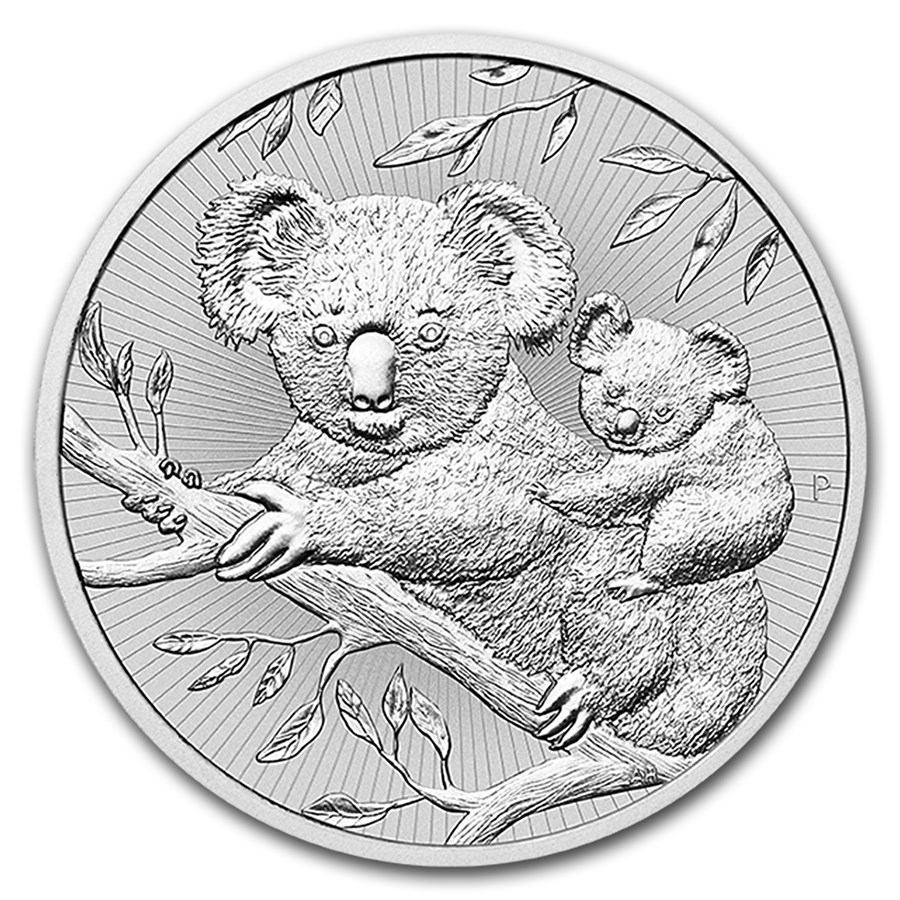 Изображение коалы, сидящей на ветке дерева, с маленьким детенышем на спине. Справа буква «Р» — символ Пертского монетного двора