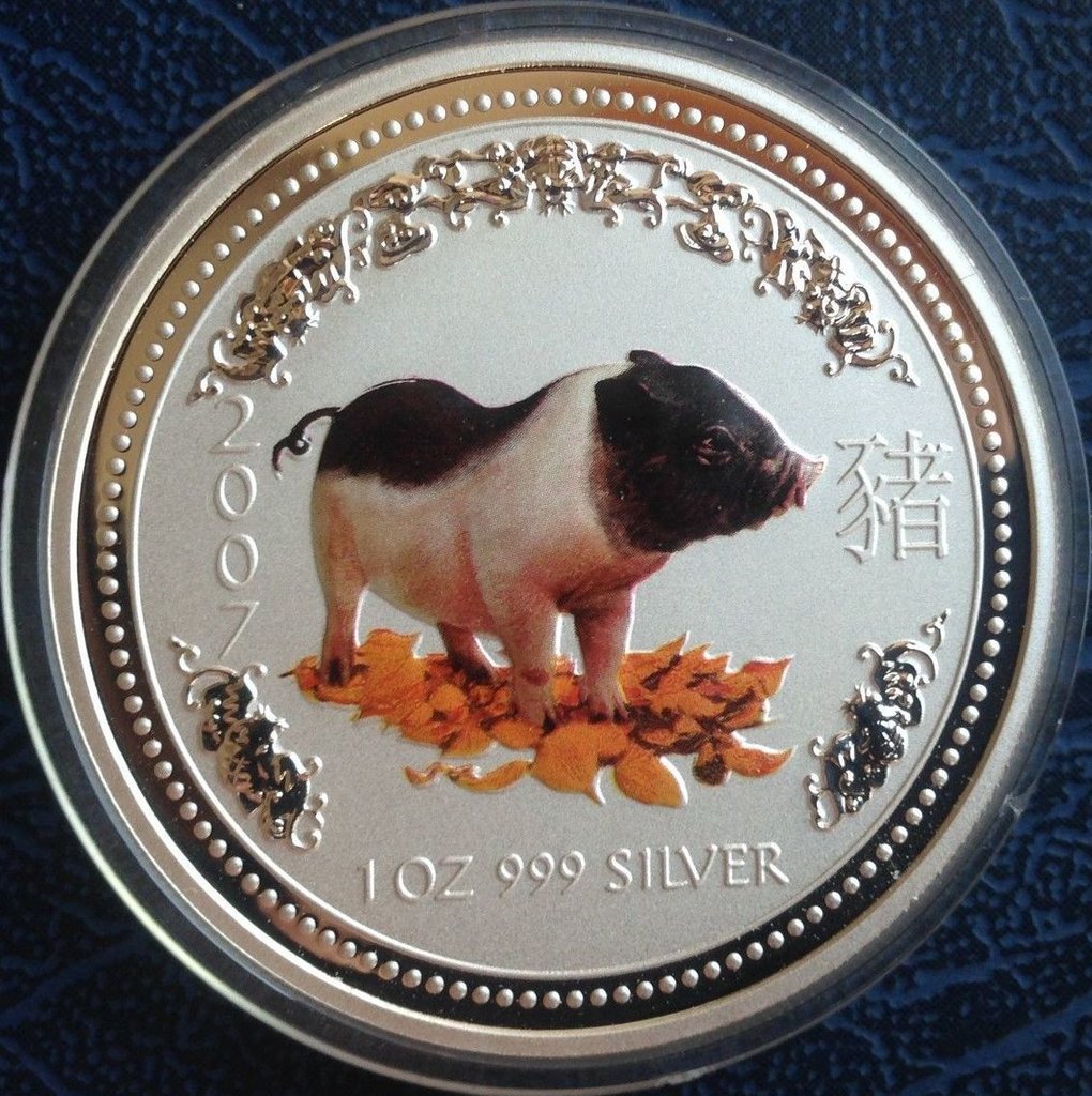 Серебряная монета Австралийский Лунар (первая серия монет) Год Свиньи, выпущенная в Австралии Пертским монетным двором.
