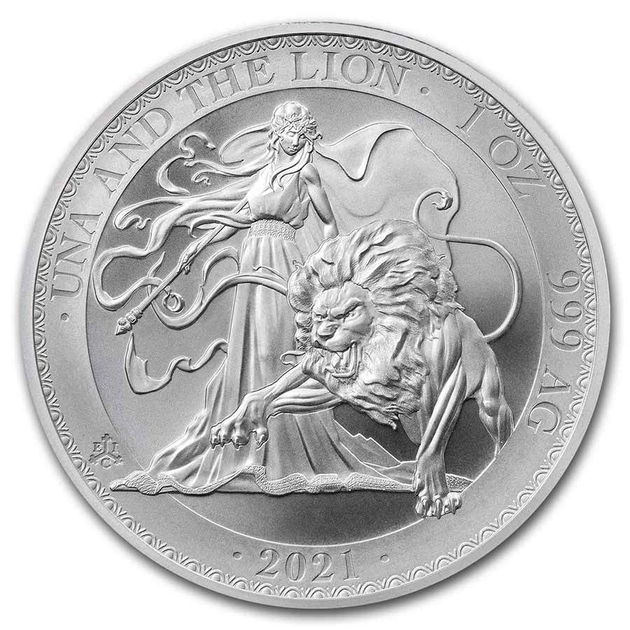 На реверсе изображена Уна, представляющая правду и чистоту, и изящно указывающая путь вперед со своим львом рядом с ней. Лев является также древним символом Британии. Надпись «Una and the Lion», а также вес и чистота металла — 1 OZ 999 AG. Снизу год выпуска — 2021.
