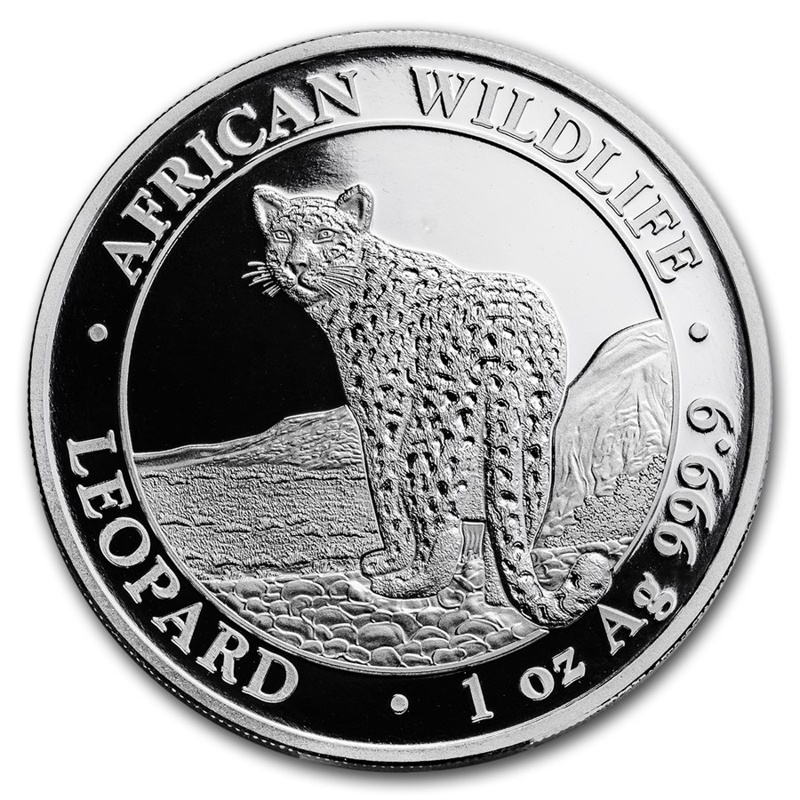 Серебряная инвестиционная монета Сомали - Леопард. Данная монета выпускается в рамках серии "Африканская дикая природа". Чеканка монеты производится на Баварском государственном монетном дворе.
