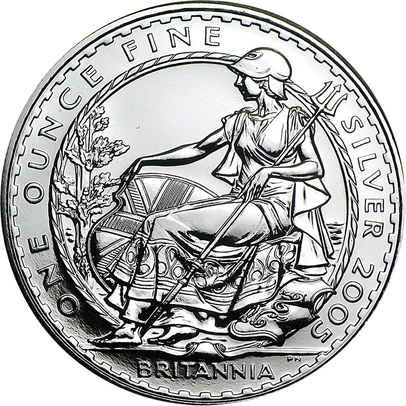 В центре - аллегорическая фигура Британии, сидящая на троне, в коринфском шлеме, с гербовым щитом, на котором изображен Юнион Джек, и трезубцем Нептуна в руках. Вокруг изображения надписи - BRITANNIA ONE OUNCE FINE SILVER 2005 (серия, вес и проба серебра, год чеканки). Инициалы дизайнера - PH (Филипп Натан) - указаны в нижней части монеты.