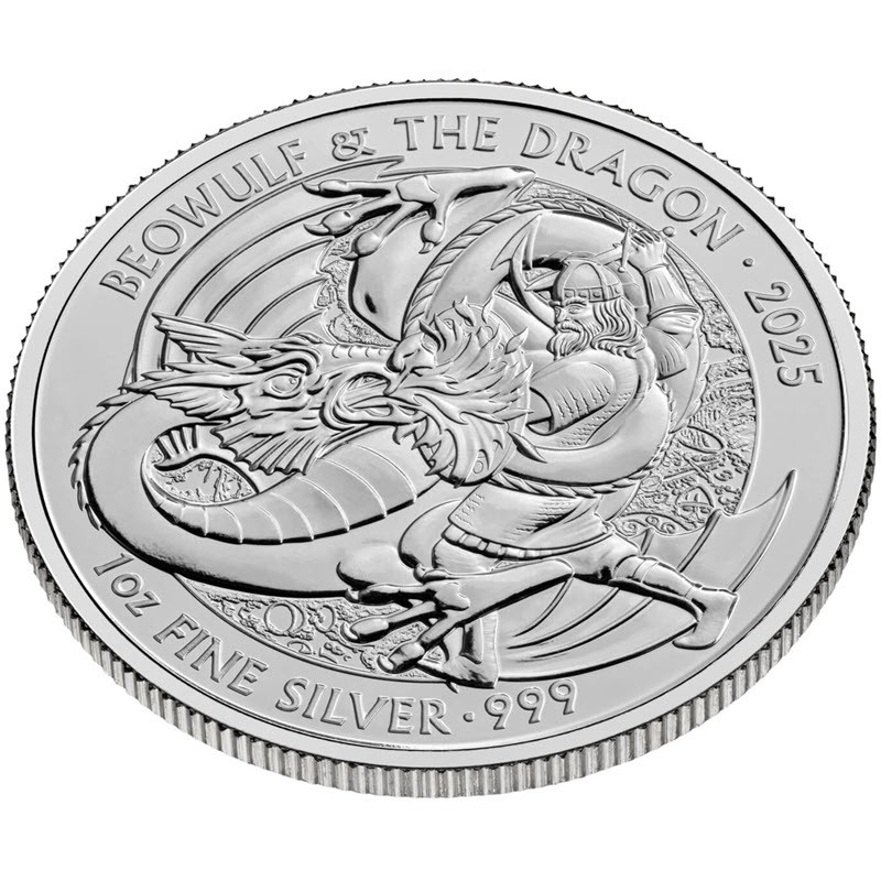 Реверс украшен подробным дизайном Дэвида Лоуренса, на котором запечатлено мужественное противостояние Беовульфа дракону. Слева внизу во внутреннем круге монограмма дизайнера: D.L (David Lawrence). Вдоль канта надпись: BEOWULF & THE DRAGON·2025 1 OZ·FINE SILVER·999 название монеты, год чеканки, вес и проба серебра).