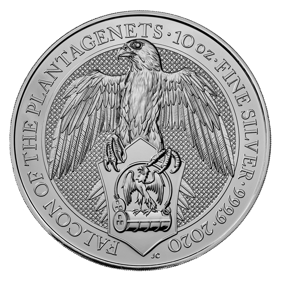 На реверсе серебряной инвестиционной монеты "Сокол Плантагенетов" - изображение сокола, держащего в лапах щит. По кругу монеты - надписи на английской языке, обозначающие "Сокол Плантагенетов", 10 тройских унций чистого серебра 999,9 пробы. Далее идет год выпуска монеты - 2020. Снизу, под изображением сокола, указаны инициалы дизайнера монеты - JC (Jody Clark).