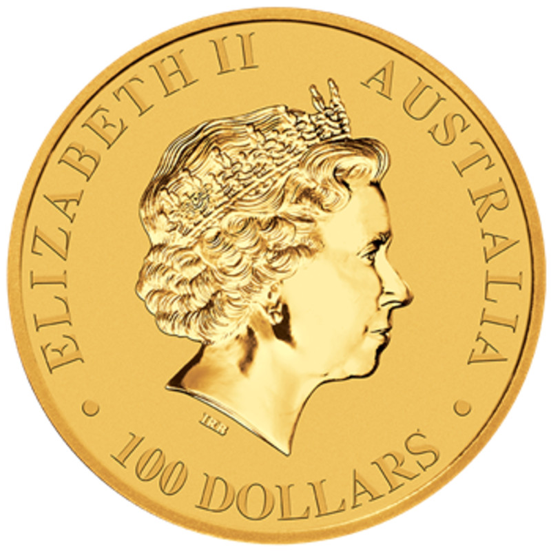 На аверсе золотой монеты Австралийский кенгуру изображен портрет королевы Елизаветы II. Сверху надпись ELIZABETH II — Елизавета II, AUSTRALIA — Австралия. Внизу номинал монеты 100 DOLLARS (100 австралийских долларов). Возле нижней стороны портрета имеется надпись «IRB», обозначающая инициалы автора изображённого портрета – Иена Рэнка-Бродли.