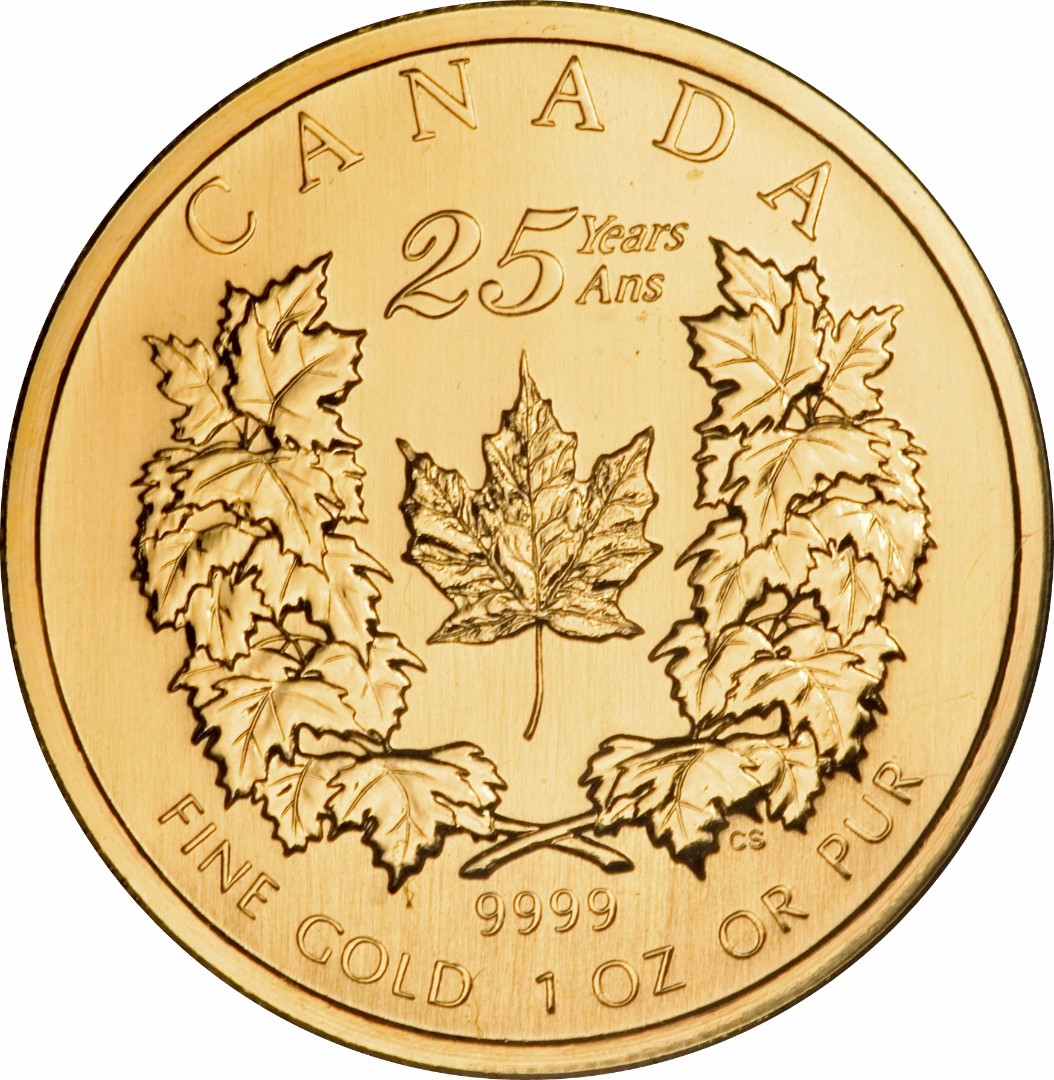 В центре изображение кленового листа — символа Канады, окруженный двумя кленовыми ветками. Сверху надпись — 25 Years / Ans. Снизу указана чистота монеты 9999 и надпись FINE GOLD (англ) — чистое золото, вес монеты 1 oz. (тройcкая унция) и надпись OR PUR (франц) — чистое золото.