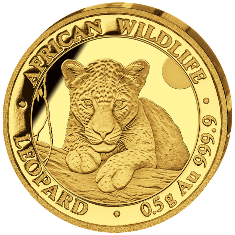 На реверсе изображен леопард, притаившийся на стволе дерева. Вдоль канта надпись: AFRICAN WILDLIFE · LEOPARD · 0.5 g Au 999.9 · (серия, леопард, вес и проба золота).