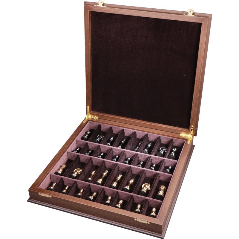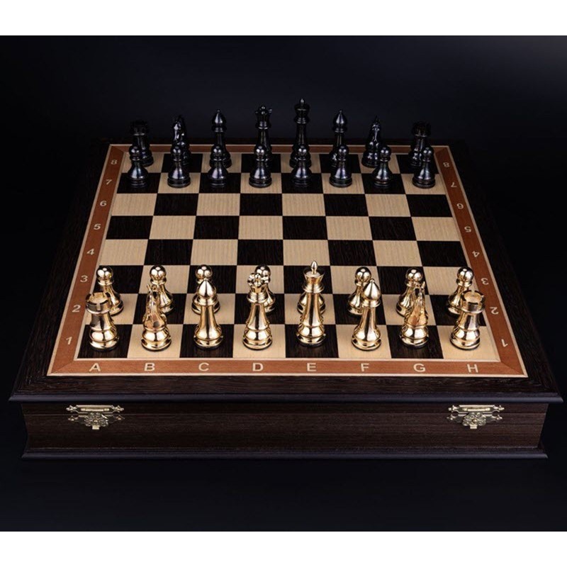 Шахматная доска служит ларцом для фигур, внутри которого нежнейший ложемент из бархата с отдельными секторами под каждую фигурку.  Доска закрывается на замки ручной работы.