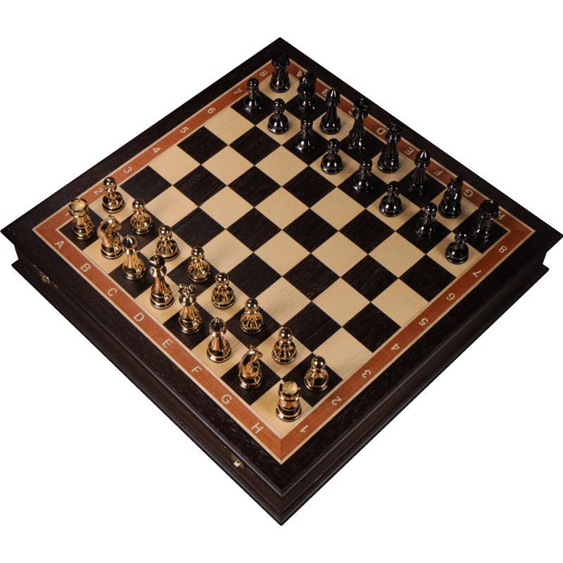 Шахматная доска служит ларцом для фигур, внутри которого нежнейший ложемент из бархата с отдельными секторами под каждую фигурку. Доска закрывается на замки ручной работы.