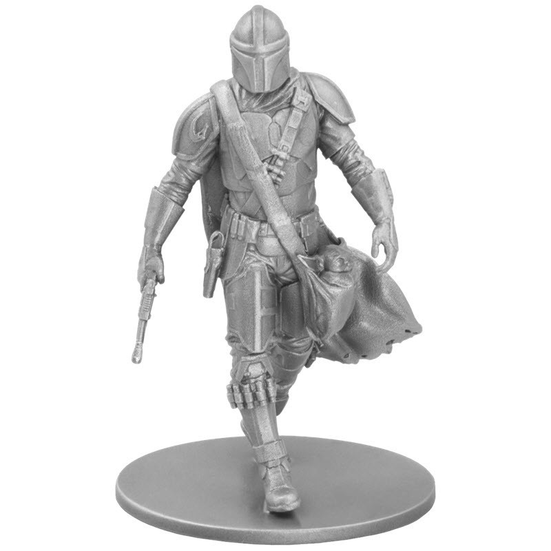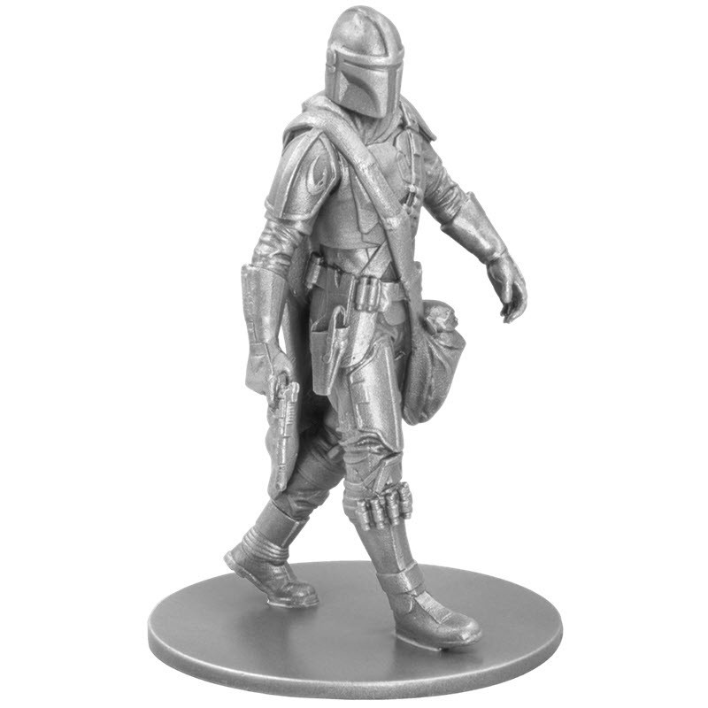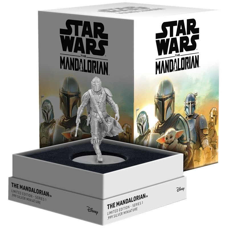 Эта чудесная серебряная миниатюра весом 150 грамм от Новозеландского Монетного Двора (NZ Mint) из серии «Звездные войны» посвящена Мандалорцу. Работа 3D-дизайнер Алехандро Перейра Эскурра (Alejandro Pereira Ezcurra). У неё размер 80 Х 50 мм и качество античной отделки. Поставляется  в оригинальном футляре «Звездных войн™». Тираж: 1000 штук.