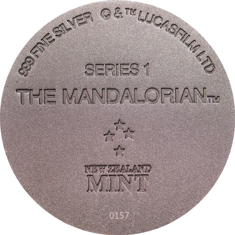 На аверсе вверху вдоль канта надпись: 999 FINE SILVER © & ™Lucasfilm LTD (проба серебра, авторские права), в центре: SERIES 1 The Mandalorian™ NEW ZEALAND MINT XXX (Серия 1, Мандалорец, монограмма монетного двора, индивидуальный номер миниатюры).