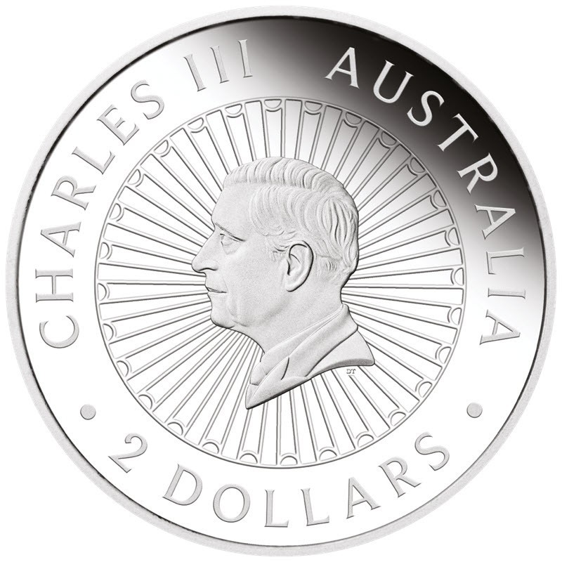 На аверсе изображен Его Величество король Чарльз III. Внизу портрета инициалы дизайнера TD (Dan Thorne). Вокруг портрета надпись: CHARLES III AUSTRALIA · 2 DOLLARS · (Чарльз III, страна-эмитент, номинал).