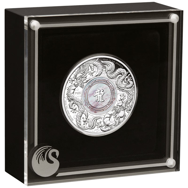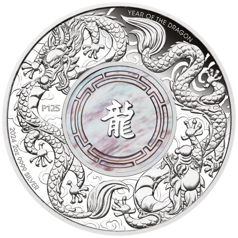 Серебряная монета от Пертского монетного двора Австралии весом 2 унции посвящена символу 2024 года - Дракону. У нее вставка из перламутра.