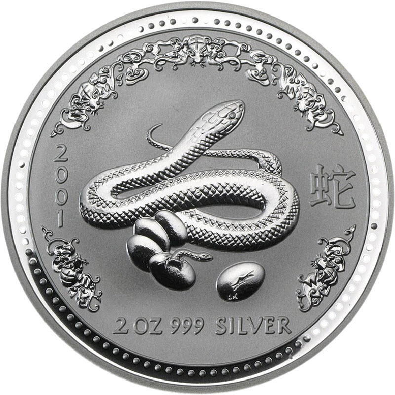 На реверсе изображена змея, свернувшаяся кольцом возле пяти яиц. Из одного яйца вылупляется змееныш. На правом яйце инициалы дизайнера LK (Louis Kwan). Слева от змеи: 2001 (год чеканки), справа: 蛇 (китайский иероглиф Змея), внизу: 2 OZ 999 SILVER (вес и проба серебра).