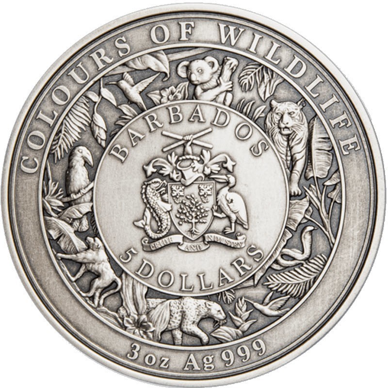 На аверсе изображен герб Барбадоса. Внизу герба девиз: PRIDE AND INDUSTRY (Гордость и трудолюбие). Вокруг герба надпись: BARBADOS 5 DOLLARS (страна-эмитент, номинал). Вдоль канта надпись: COLOURS OF WILDLIFE 3 oz Ag 999 (серия, вес и проба серебра). На гурте индивидуальный номер монеты.