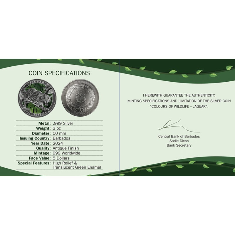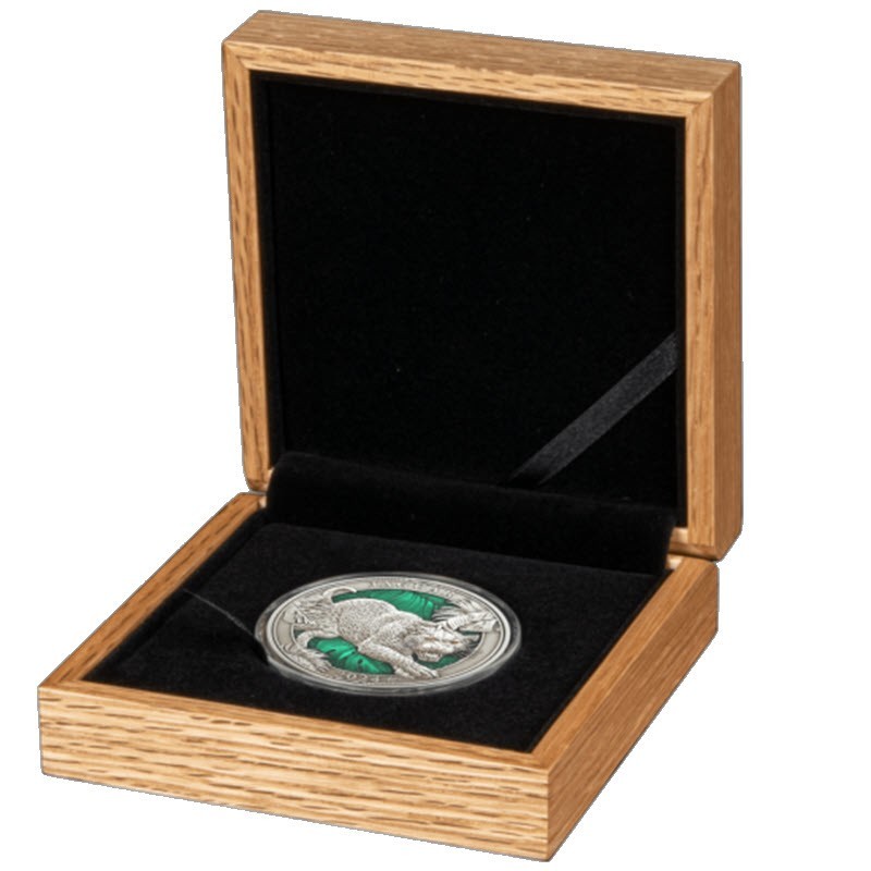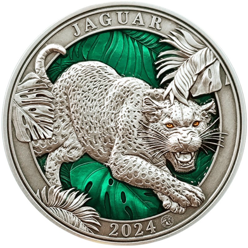 Эта удивительная серебряная монета в 3 унции посвящена ягуару из серии «Цвета дикой природы». Она покрыта полупрозрачной зеленой и желтой эмалью, создающей потрясающий 3D-эффект. У нее ультравысокий рельеф и античная отделка. Индивидуальная нумерация на гурте. Поставляется в роскошном деревянном футляре с сертификатом подлинности. Тираж: 999 штук.