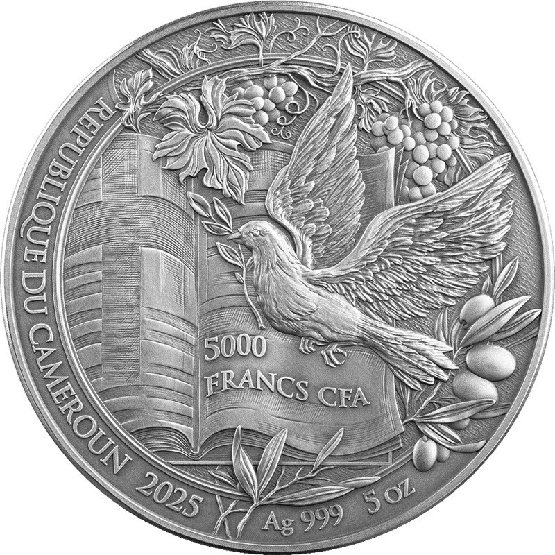 На аверсе изображен голубь, несущий оливковую ветвь, символизирующий мир и победу. Фоном служат виноградные лозы и оливковые ветви. Под голубем надпись: 5000 FRANCS CFA (номинал). Вдоль канта надпись: REPUBLIQUE DU CAMEROUN 2025 Ag 999 5 OZ Silver (страна-эмитент, год чеканки, вес и проба серебра).