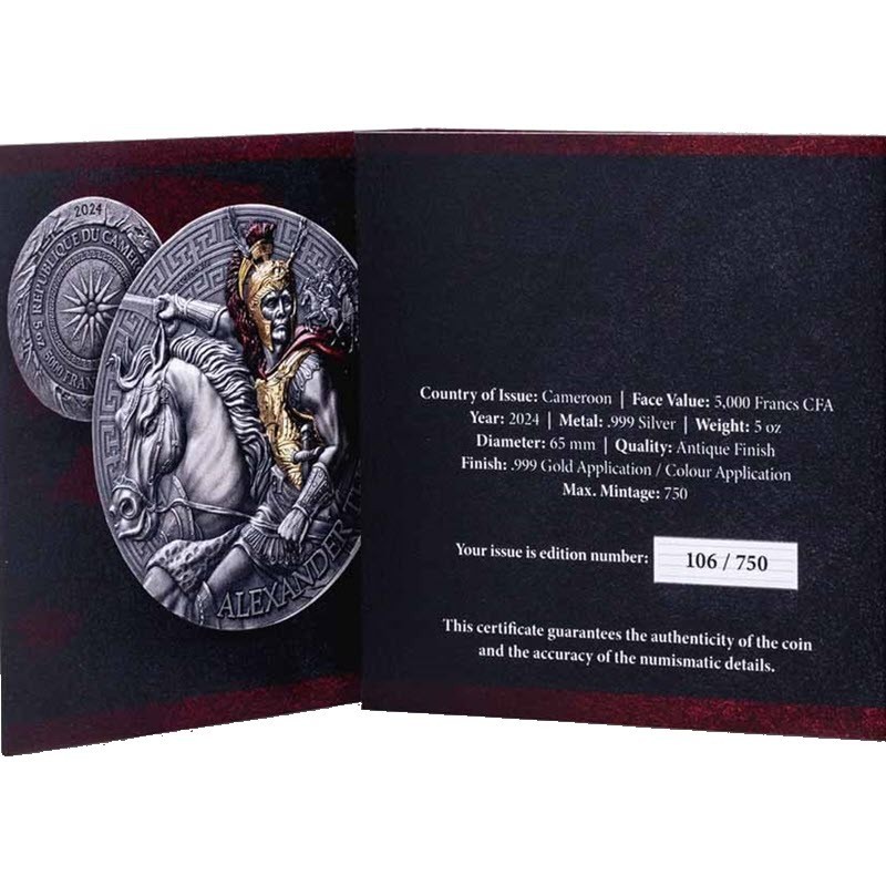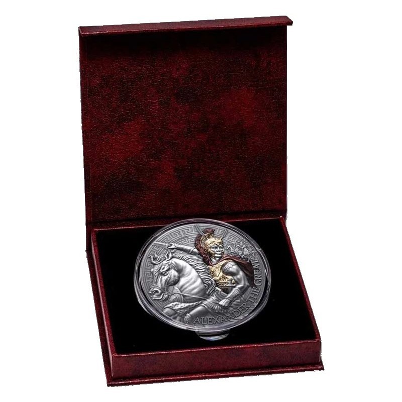 Эта удивительная серебряная монета весом в 5 унций – вторая из серии «Великие полководцы» - посвящена Александру Македонскому. У нее качество античной отделки, высокий рельеф, выборочное золочение и селективная окраска. Поставляется в оригинальном футляре с сертификатом подлинности. Тираж: 750 штук.