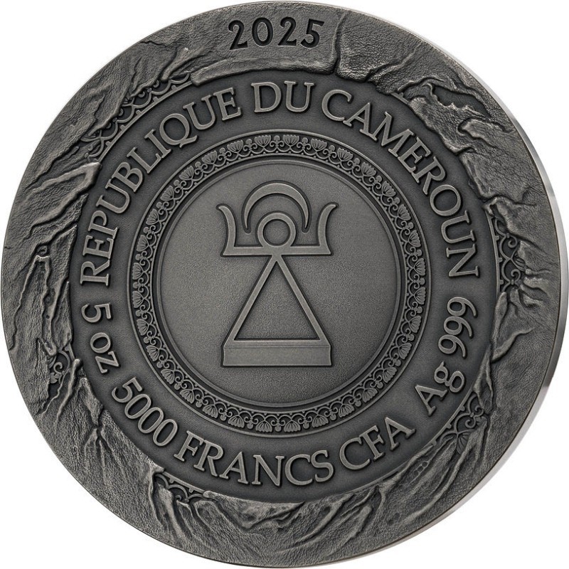 На аверсе изображена пиктограмма Карфаген (Ганнибал у ворот). Вверху надпись: 2025 (год чеканки). Вокруг пиктограммы надпись: REPUBLIQUE DU CAMEROUN 5 oz 5000 FRANCS CFA Ag 999 (страна-эмитент, вес и проба серебра, номинал). На гурте индивидуальный номер монеты.