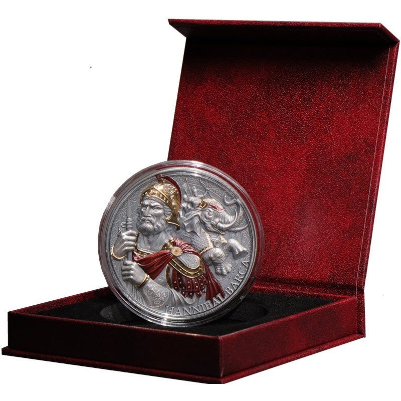 Эта удивительная серебряная монета весом в 5 унций – третья из серии «Великие полководцы» - посвящена Ганнибалу. У нее качество античной отделки, высокий рельеф, выборочное золочение и селективная окраска. Поставляется в оригинальном футляре с сертификатом подлинности. Тираж: 750 штук.