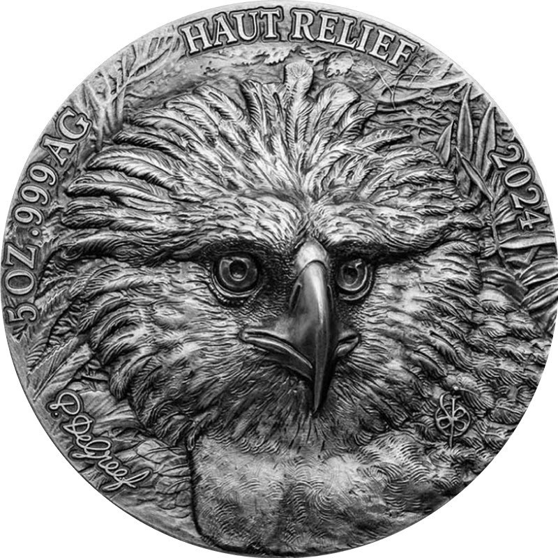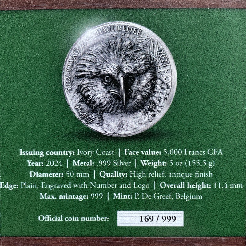 На реверсе изображена детально проработанная голова орла. Вдоль канта надпись: P.DeGreef HAUT-RELIEF 5OZ .999 AG 2024 (монограмма П. де Грефа, высокий рельеф, вес и проба серебра, год чеканки).