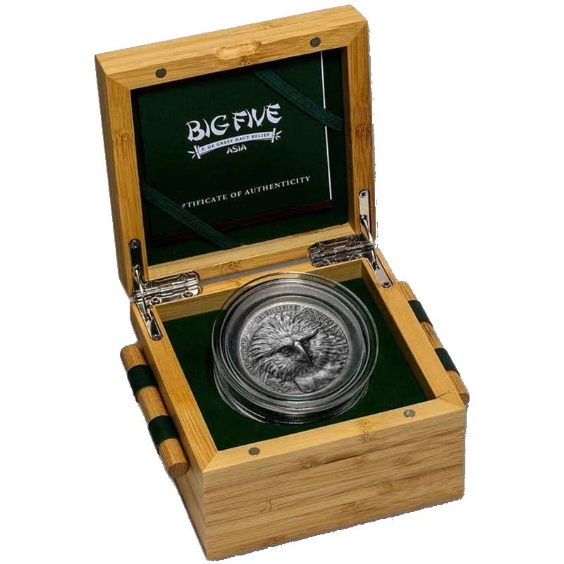 Эта серебряная монета из серии «Большая пятерка Азии». Дизайн был реализован медальерами студии П. Де Грефа (на реверсе монограмма студии) на высочайшем уровне, даже такие тонкости, как перья, впечатляюще смотрятся. Индивидуальная нумерация на гурте. У нее невероятный горельеф и античная отделка. Поставляется в роскошном деревянном футляре с сертификатом подлинности. Тираж: 999 штук.