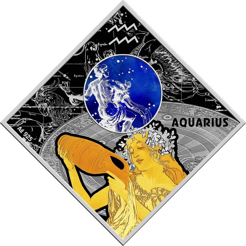 В верхней части монеты символ знака зодиака Водолей, вставка из кобальтового стекла с изображением созвездия Водолея. Внизу изображение девушки с горшком, символизирующее Водолея, с венком из цветов на голове на фоне рисунка, изображающего Солнечную систему. С правой стороны находится латинское название знака Зодиака – AQUARIUS, а с левой стороны проба Ag925.