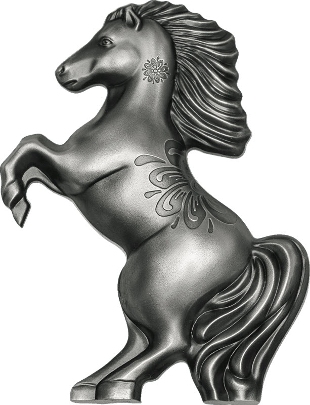Эта удивительная серебряная монета «Год Лошади» весом в 1 унцию посвящена тем, кто родился под знаком Лошади: духам огня, свободы и неукротимого движения. У нее размеры 29 Х 38 мм и  качество античной отделки. Поставляется в футляре с сертификатом подлинности. Тираж: 999 штук.
