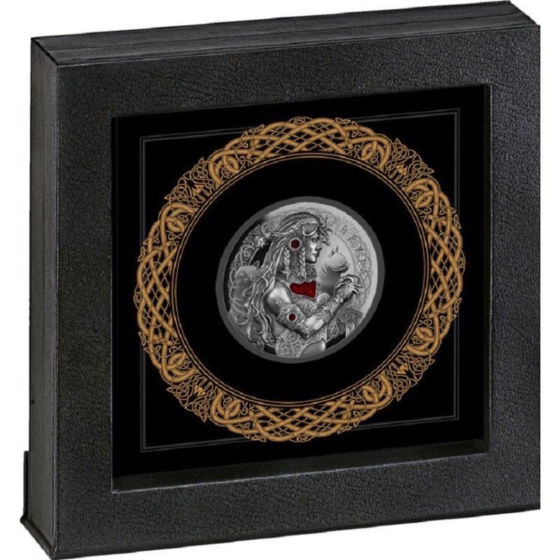 Эта невероятная серебряная монета весом в 2 унции посвящена покровительнице любви, считающейся самой красивой из скандинавских богинь: Фрейе. Монета имеет качество Black Proof с селективной античной отделкой, частично окрашена и имеет красивый горельеф. Монета поставляется в красивом футляре вместе с сертификатом подлинности. Ограниченный тираж 500 штук по всему миру!