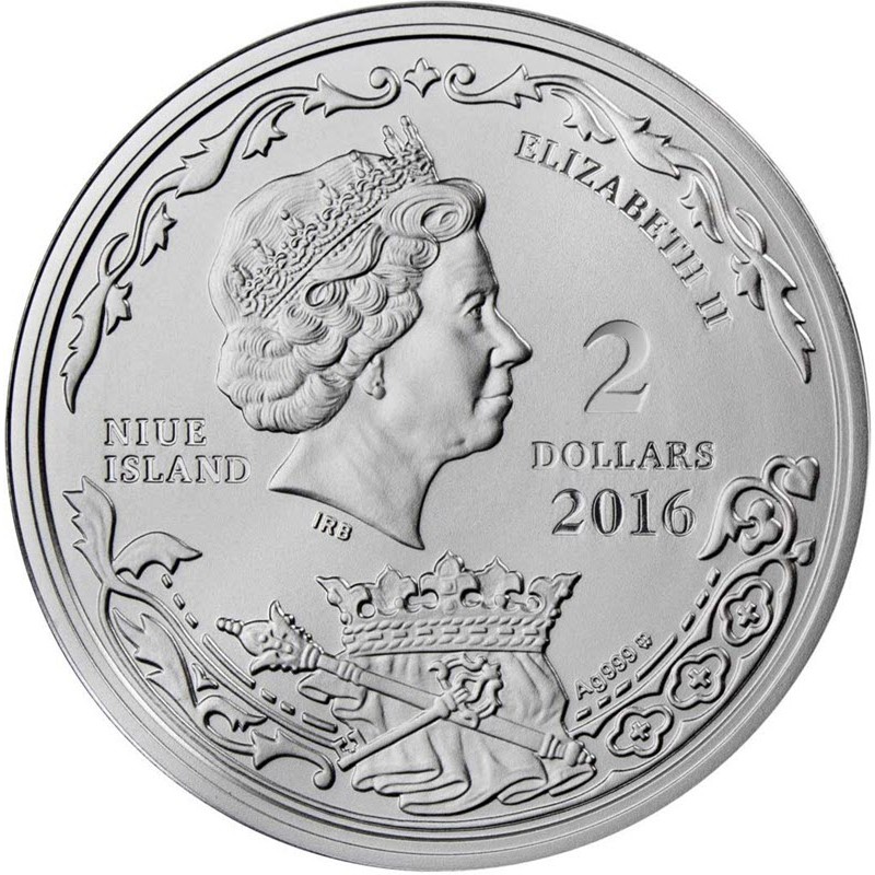 На аверсе изображена Ее Величество королева Елизавета II в бриллиантовой тиаре. Под портретом королевы выгравированы инициалы дизайнера IRB (Ian Rank Broadley). Вверху справа надпись: ELIZABETH II (Елизавета II), слева:  NIUE ISLAND (страна-эмитент), справа: 2 DOLLARS 2016 (номинал, год чеканки), ниже: Ag999 mw (проба серебра, монограмма польского монетного двора). Внизу царские регалии.