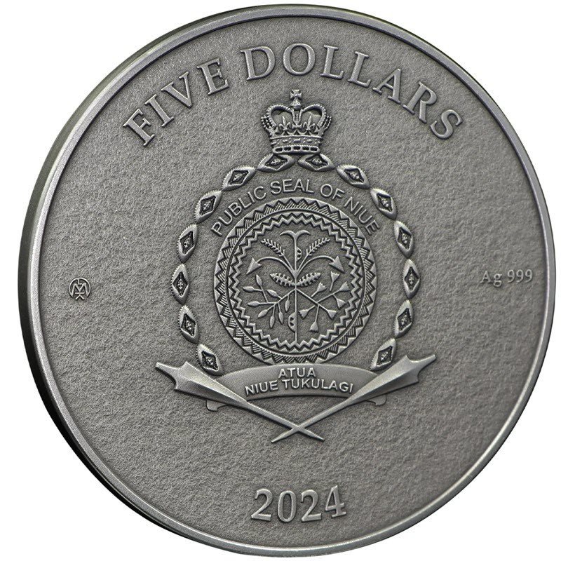 На аверсе монеты изображена неофициальная «Государственная печать Ниуэ». Это композиция из растений в центре внутри двойного декоративного круга, окруженного морскими раковинами. Он увенчан короной Святого Эдуарда (символом Соединенного Королевства, монарх которого в конечном итоге является главой государства Ниуэ). Сверху между ними надпись PUBLIC SEAL OF NIUE. Ниже на ленте в две строки изображен девиз ATUA NIUE TUKULAGI, ниже которых две перекрещенные катуа. Вдоль канта надпись: FIVE DOLLARS LM Ag999 2024 (номинал, монограмма литовского монетного двора, проба серебра, год чеканки).