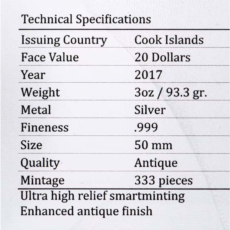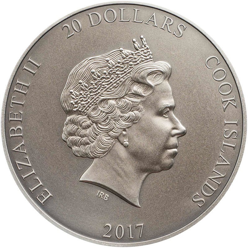 На аверсе изображена Ее Величество королева Елизавета II в бриллиантовой тиаре. Под портретом инициалы дизайнера IRB (Ian Rank Broadley). Вдоль канта надпись: ELIZABETH II 20 DOLLARS COOK ISLANDS 2017 (Елизавета II, номинал, страна-эмитент, год чеканки).