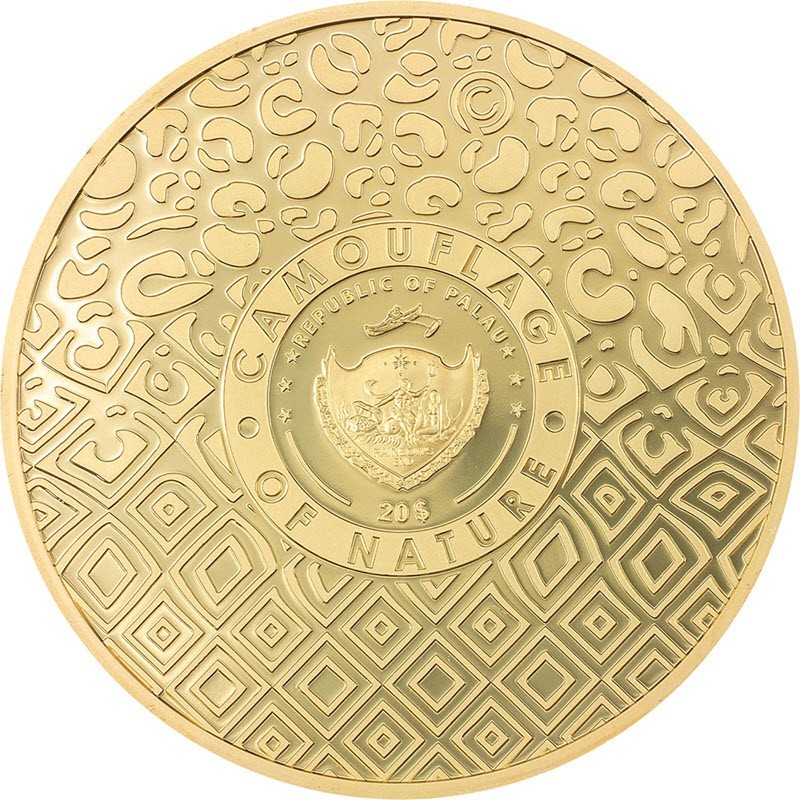 На реверсе изображена завораживающая оптическая иллюзия с эффектом сворачивания пятен, напоминающих раскраску кошачьего меха, с Леопардом в центре. Основной мотив еще больше соответствует идее кошачьего меха, именно золочение придает очень актуальную окраску. Внизу на канте: 2024 (год чеканки).