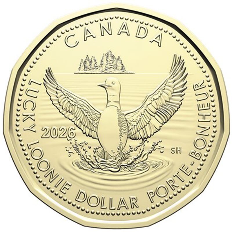 На реверсе изображена гагара с поднятыми в форме буквы «V» крыльями, символизирующими победу, садящаяся на воду. Слева: 2026 (год чеканки), справа инициалы дизайнера SH (Steve Hepburn) Внизу вдоль канта надпись: CANADA LOONIE DOLLAR PORTE-BONHEUR (страна-эмитент, талисман счастливый доллар).