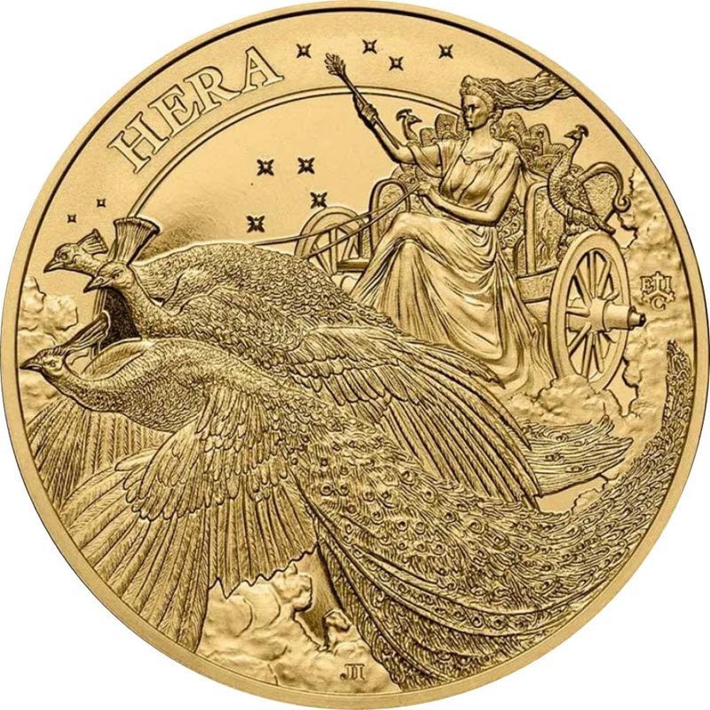 «Богиня Гера» - первая из серии, жена могущественного Зевса и мать олимпийских богов Ареса и Гефеста. Легенда Овидия описывает, как Зевс влюбился в Ио, одну из жриц Геры. Разбушевавшись от ревности, Гера превратила Ио в корову и отдала Аргусу, своему всевидящему великану со 100 глазами, охранять ее. Зевс сжалился над Ио и приказал своему посланнику Гермесу убить Аргуса и спасти ее. Но Гера догадалась, что грядет, и, прежде чем Гермес успел загипнотизировать и убить Аргуса, удалила у великана 100 глаз и поместила их на хвост павлина в честь своего верного слуги.