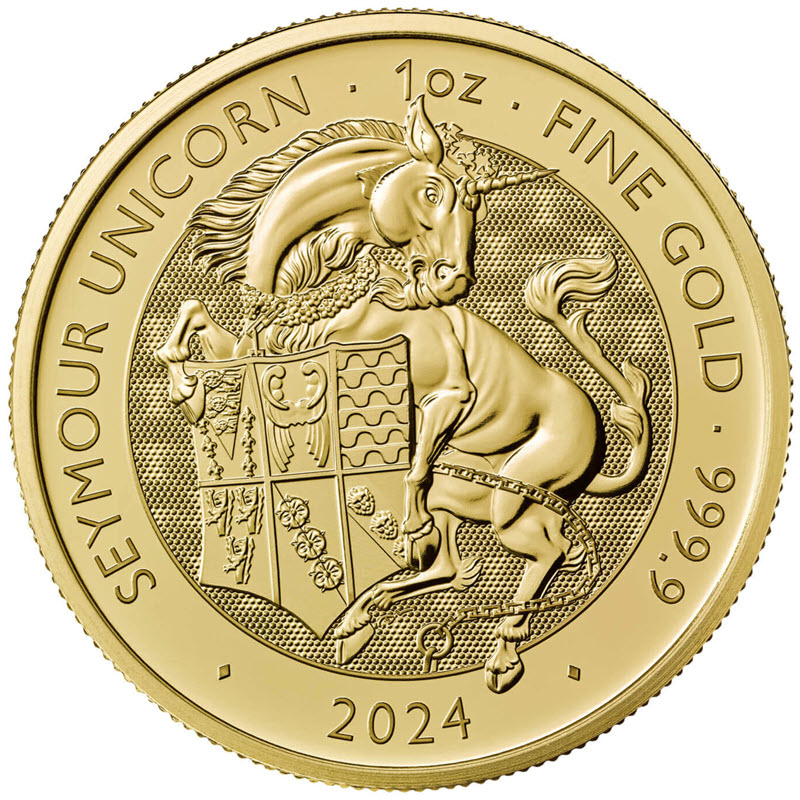 Вдоль канта надпись: SEYMOUR UNICORN · 1oz · FINE GOLD · 999.9 ♦ 2024 ♦  (Единорог Сеймура, вес и проба золота, год чеканки).
