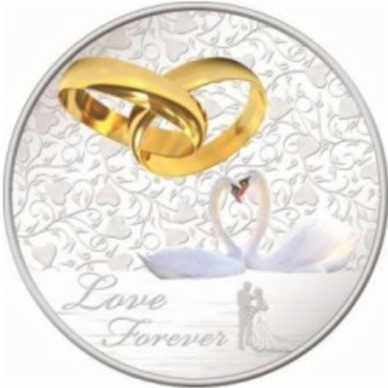 Изображение пары молодоженов, пары лебедей и пары золотых колец. Надпись — LOVE FOREVER.