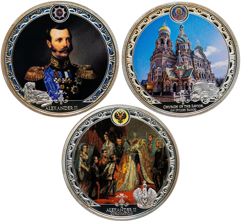 Этот чудесный набор из трех серебряных монет посвящен императору Александру II. Поставляется в оригинальном футляре с сертификатом подлинности. Тираж: 8 000 штук.
