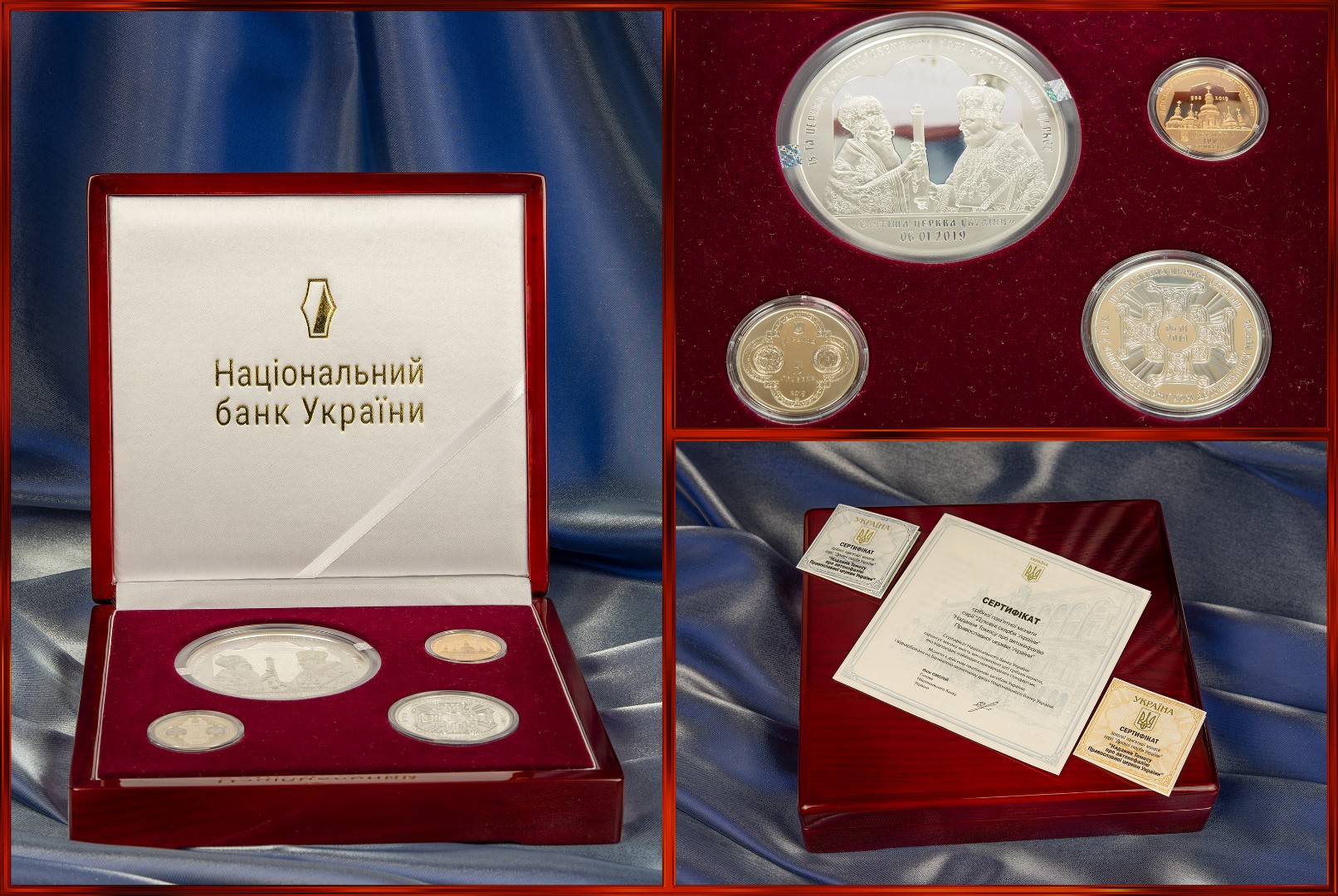 Набор коллекционных монет Украины, в который включены: золотая монета 100 гривен весом 31.1 г., серебряная монета 50 гривен весом 500 грамм, серебряная монета 20 гривен — 62.2 грамма и монета из никелированного серебра 5 гривен весом 16.54 грамма. Набор упакован в деревянную коробку с сертификатами.