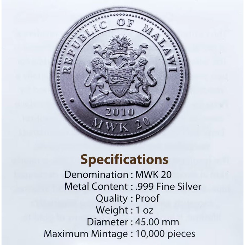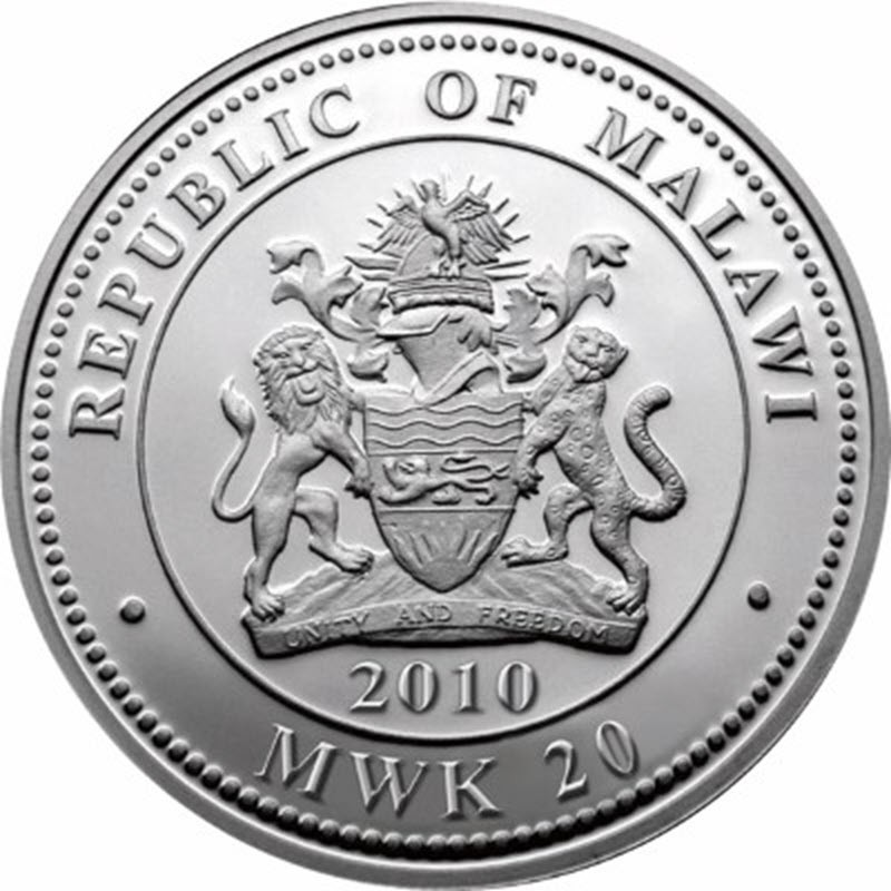 На аверсе всех монет изображен герб Малави. Под  гербом надпись: 2010 (год чеканки). Вдоль канта надпись: REPUBLIC OF MALAWI • MWK 20 • (страна-эмитент, номинал).