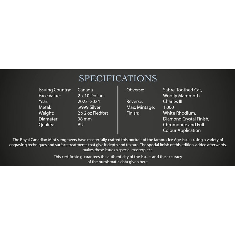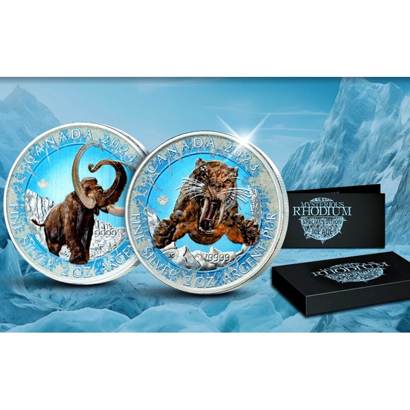 Набор из двух серебряных монет «Ледниковый период» от Королевского монетного двора Канады 2023-2024 годов. У них качество BU, селективная окраска, у гор покрытие белым родием, на канте бриллиантовые кристаллы. Поставляются в оригинальном футляре с сертификатом подлинности. Тираж: 1000 штук.