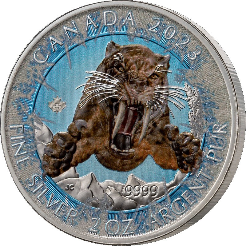 На реверсе монеты 2023 года изображен саблезубый тигр на фоне гор. Под тигром надпись: JC 9999 (инициалы дизайнера Julius Csotonyi, проба серебра). Вдоль канта надпись: CANADA 2023 FINE SILVER 2 OZ ARGENT PUR (страна-эмитент, год чеканки, вес и проба серебра).
