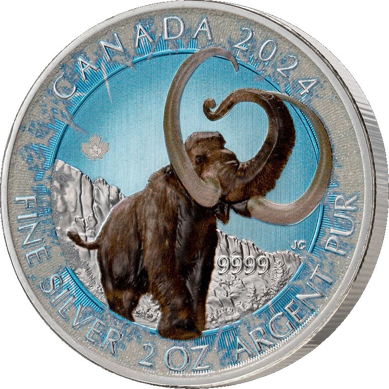 На реверсе монеты 2024 года изображен мамонт на фоне гор. Справа от мамонта надпись: JC 9999 (инициалы дизайнера Julius Csotonyi, проба серебра). Вдоль канта надпись: CANADA 2024 FINE SILVER 2 OZ ARGENT PUR (страна-эмитент, год чеканки, вес и проба серебра).
