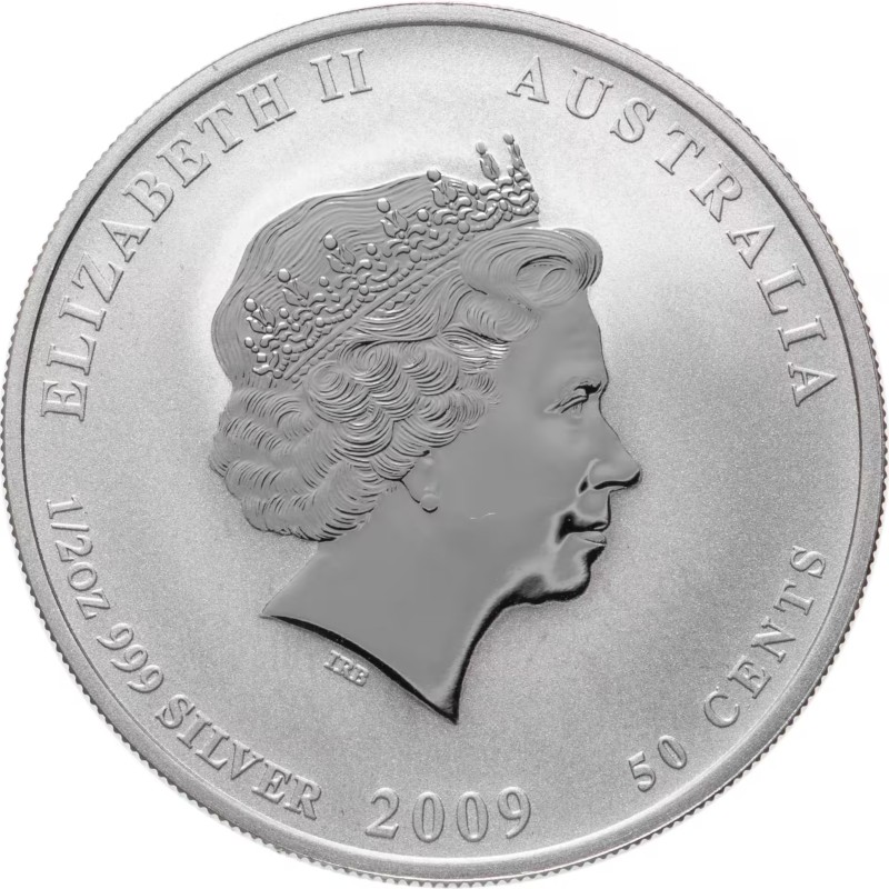 На аверсе изображен портрет Её Величества Королевы Елизаветы II дизайнера Иена Рэнка-Бродли (IRB). По окружности надписи: ELIZABETH II AUSTRALIA 1/2 OZ 999 SILVER 2009 50 CENTS (королева Елизавета II, страна-эмитент, вес серебра и год чеканки, номинал).