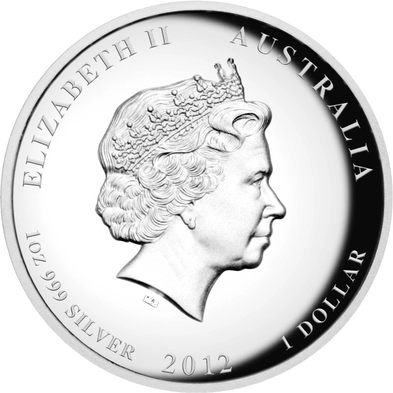 На аверсе изображен профиль королевы Елизаветы II. Сверху надпись ELIZABETH II и AUSTRALIA. Внизу по ободу указан номинал монеты (1 DOLLAR), вес (1 oz) и  год чеканки (2012),проба серебра в монете (999 SILVER).