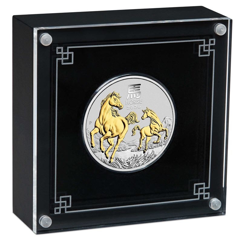 Серебряная монета из серии "Лунный календарь - III" от Пертского монетного двора Австралии весом в 1 тройскую унцию посвящена символу 2026 года – Лошади. У нее качество BU и выборочное золочение. Поставляется в футляре с сертификатом подлинности. Тираж: 25000 штук.