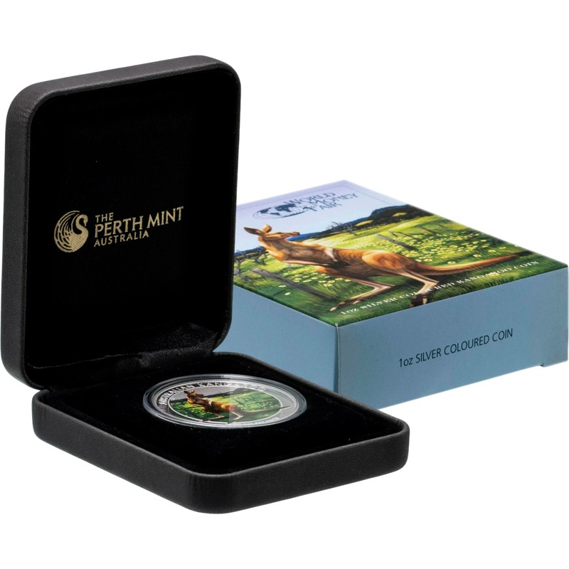 Эта чудесная серебряная 1 унцовая монета Пертского монетного двора Австралии посвящена самому узнаваемому животному континента — красному кенгуру. Эта монета с цветным изображением кенгуру – спецвыпуск, отчеканенный для Всемирной выставки монет (World Money Fair), проходившей в Берлине в 2014 году. Тираж составил всего 2000 экземпляров. У неё качество пруф, селективная окраска, поставляется в футляре с сертификатом подлинности.