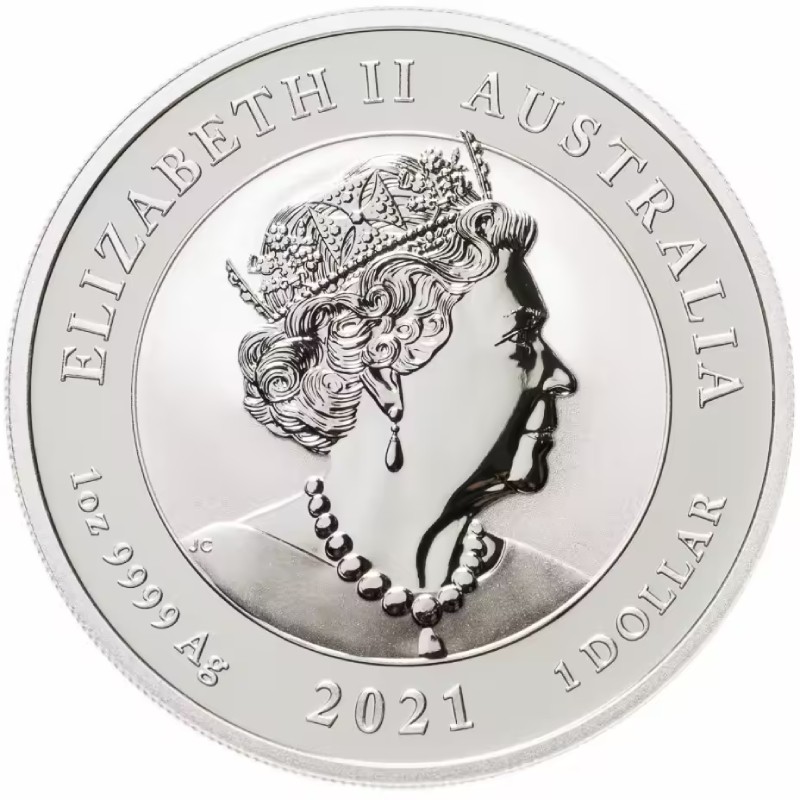 На аверсе изображен портрет Её Величества Королевы Елизаветы II дизайнера Джоди Кларк (JC). Вдоль канта надписи: ELIZABETH II AUSTRALIA 2021 1 oz 9999 Ag 1 DOLLAR (Елизавета II, страна-эмитент, вес и проба серебра, год чеканки, номинал).