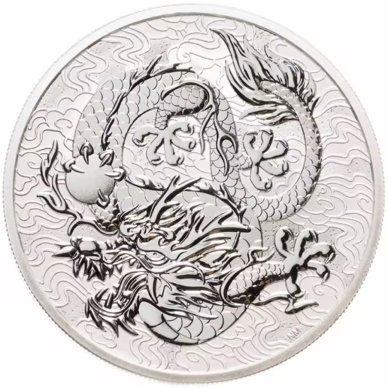 Серебряная монета "Дракон с пылающей жемчужиной" из серии "Китайские мифы и легенды" Пертского монетного двора. У нее качество анциркулейтед. Тираж: 45000 штук.